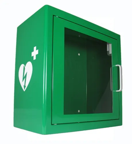 Odolná ocelová vitrína na defibrilátory s novým mezinárodním logem ILCOR pro defibrilátory a oficiální zelenou barvou.