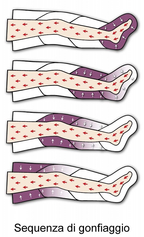 Der Druck wird immer nur von einer Kammer ausgeübt, als würde die Kosmetikerin die beiden Hände im Kreis schließen und vom Fuß ausgehend bis in die Leiste drücken. Simulation einer manuellen Lymphdrainage zur Bekämpfung von Cellulite, Wassereinlagerungen und als Hilfsmittel beim Abnehmen.