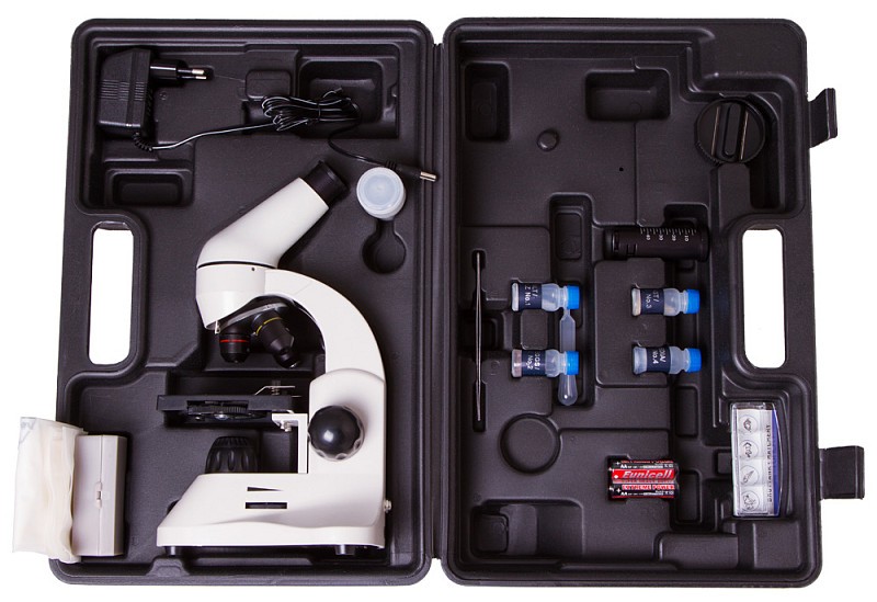 El microscopio está equipado con un estuche de plástico cómodo y fiable. El estuche permite almacenar y transportar el instrumento de forma segura: tenga la seguridad de que el microscopio está protegido contra el polvo y los golpes.