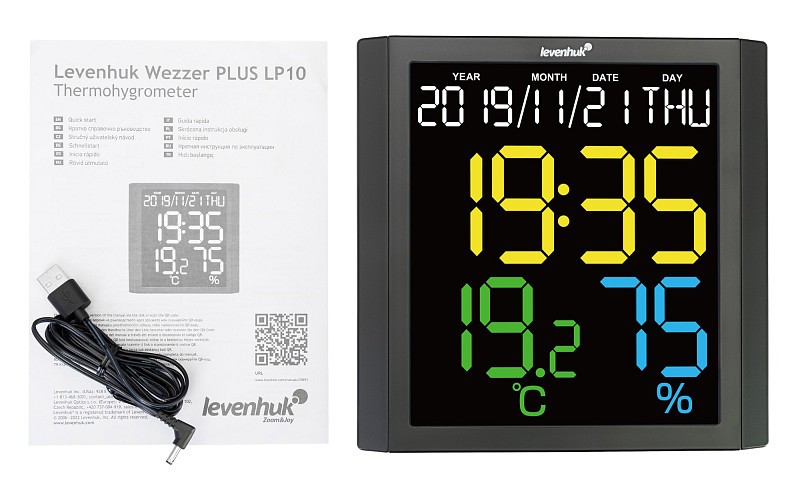 Tutte queste informazioni sono visualizzate sul pratico schermo retroilluminato le varie misure sono identificate da diversi colori. Il Levenhuk Wezzer PLUS LP10 può essere alimentato a batterie o tramite rete elettrica AC. Il piedistallo pieghevole da tavolo consente di posizionare comodamente il termoigrometro su un comodino, un davanzale o una scrivania.