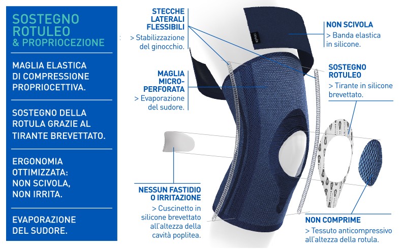 ERGONOMIA : Grazie alla benda elastica siliconata situata sulla coscia, la ginocchiera non scivola ed ha una tenuta eccellente. Il cuscinetto brevettato posizionato dietro al ginocchio (cavità poplitea) evita fastidi ed irritazioni. La rotula è protetta dalle compressioni grazie alla zona realizzata in tessuto anticompressivo. La maglia microperforata permette di far evaporare il sudore per offrire il massimo comfort.