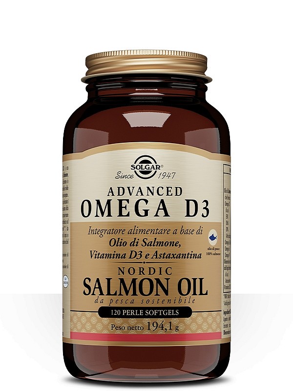 ADVANCED OMEGA D3 è l’integratore alimentare Solgar® con formulazione premium a base di olio di Salmone ottenuto da pesce pescato in modo sostenibile nelle fredde e cristalline acque delle regioni nordiche europee. Il Salmone nordico è una delle fonti più ricche di EPA e DHA, gli acidi grassi polinsaturi della serie Omega-3. Quest’olio fornisce lo spettro completo degli acidi grassi polinsaturi Omega (3,5,6,7,9). L'olio di salmone è sottoposto ad un processo di purificazione che ne preserva l'integrità e la qualità.