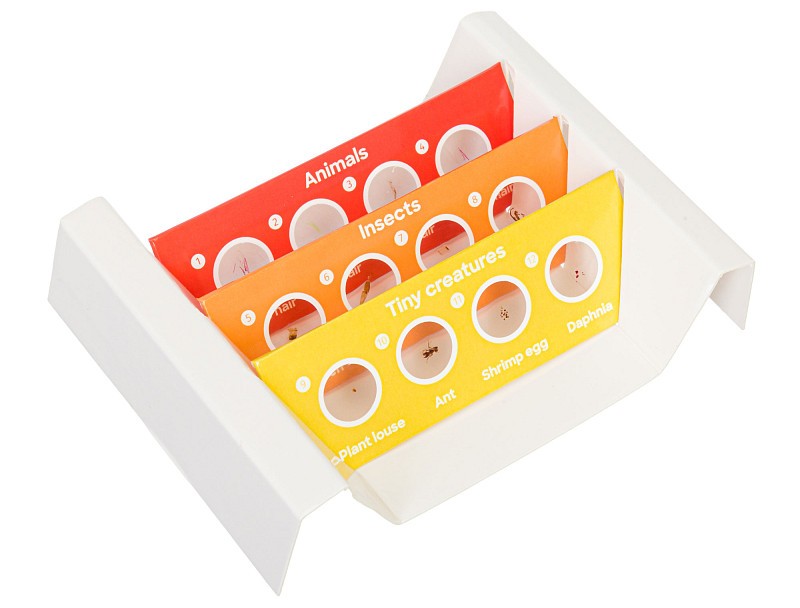 Wszystkie próbki są podzielone na trzy grupy według kategorii. Slajd reprezentuje całą grupę i zawiera cztery próbki. Każda próbka jest dobrze oznaczona, dzięki czemu można szybko zidentyfikować, co chce się zbadać. Zestaw 12 preparatów przygotowanych Levenhuk Discovery Fauna jest kompatybilny z każdym mikroskopem biologicznym o słabym oświetleniu, w tym z modelami dla dzieci i młodzieży.