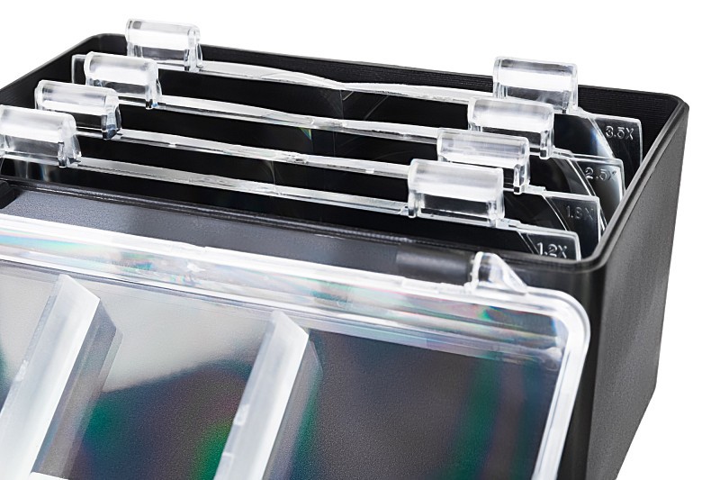 Soczewki są prostokątne i przeznaczone do obserwacji obojgiem oczu. Materiał soczewki to optyczne szkło polimerowe o wysokim stopniu przezroczystości. Jest to solidny i trwały materiał, który odtwarza wyraźne i bogate w kontrast obrazy. Na lupie można zamontować jedną lub dwie soczewki (szeregowo).