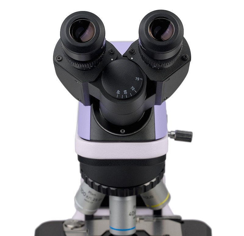 La testata è progettata per alloggiare due oculari e adotta il sistema ottico all’infinito. I tubi della testata possono roteare completamente sul proprio asse e l’estrazione pupillare è regolata in base all’altezza dell’utente. Il microscopio presenta 2 oculari 10x/20 mm standard. Il set include inoltre conchiglie oculari in gomma per coloro che indossano gli occhiali: le conchiglie fungono da strato tra le lenti degli occhiali e gli oculari, oltre a proteggere le lenti da abrasioni, graffi e danni. Ogni tubo è dotato di una ghiera di regolazione diottrica: è possibile regolare la messa a fuoco per adattarsi alla visione dell’utente. Questa funzionalità sarà particolarmente utile per i ricercatori con una vista diversa poiché è possibile regolare ogni oculare in modo indipendente. Se ci fosse la necessità di connettere una fotocamera digitale al microscopio, è possibile posizionarla su uno dei due tubi dopo aver rimosso un oculare.