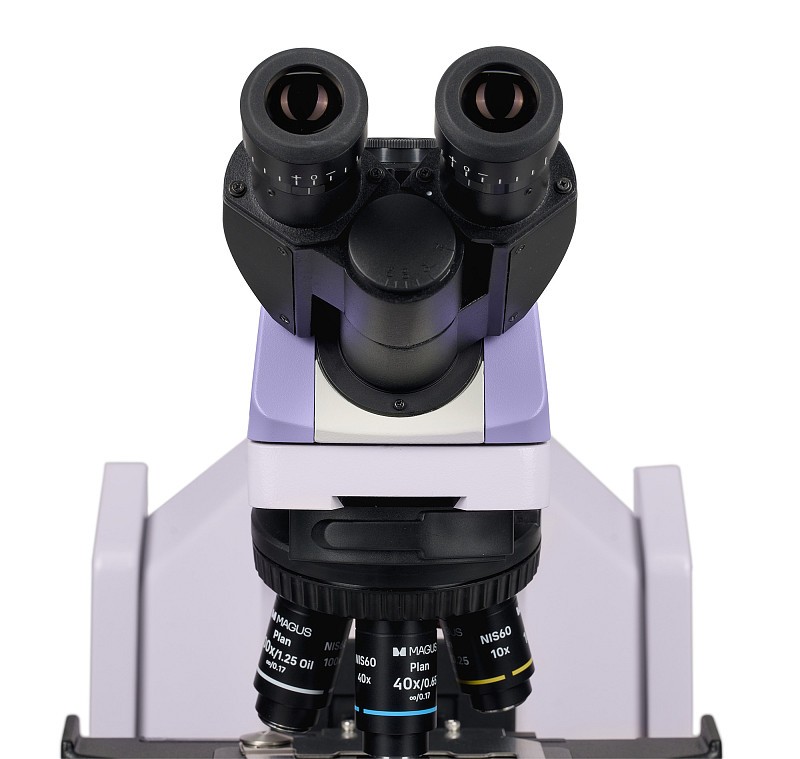 Testata trinoculare con ottiche corrette all’infinito. I tubi oculari possono ruotare di 360°. L’utente può regolare l’estrazione pupillare dell’oculare per adattarla alla propria altezza. La fotocamera digitale può essere installata nel tubo trinoculare. Il beam splitter lungo il cammino ottico ha un rapporto 50/50. Il kit di base include oculari da 10x/22 mm con regolazione del diottero e una lunga estrazione pupillare per l’utilizzo con occhiali.
