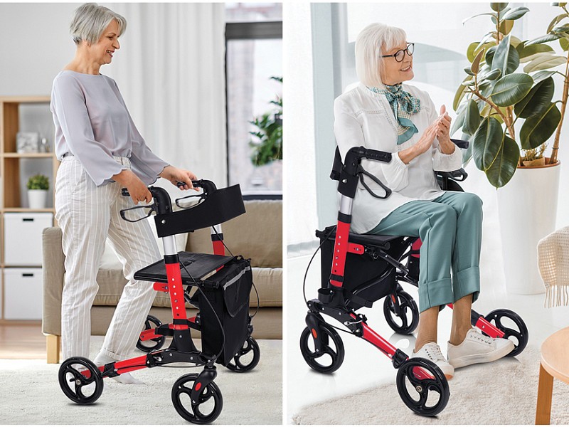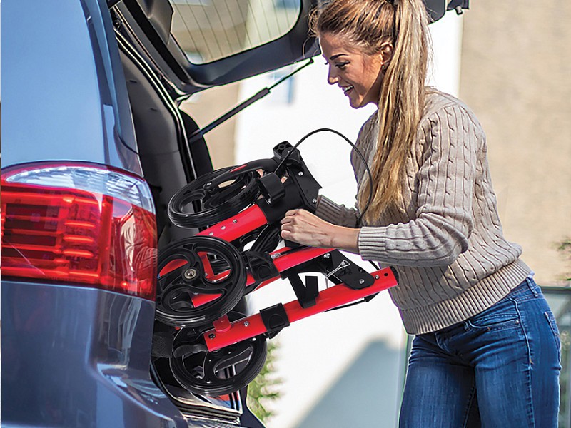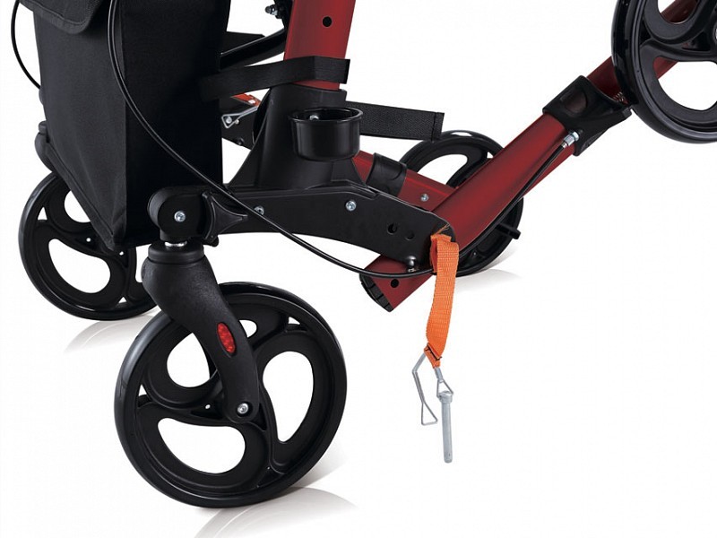 Držiak na palicu. Dve otočné a sklopné predné kolesá, dve sklopné zadné nohy pre kompaktnejšie rozmery.